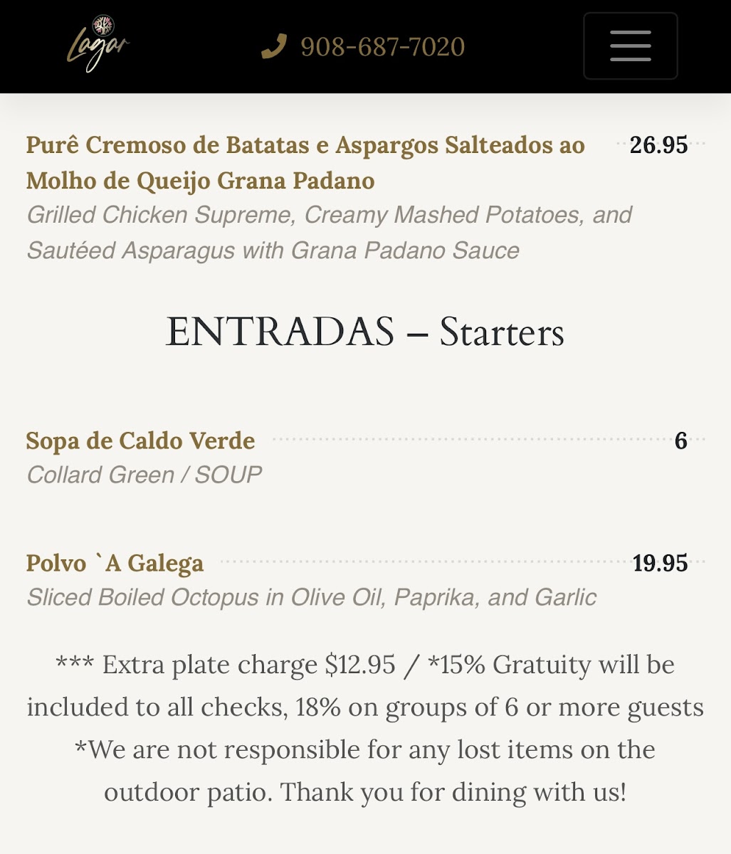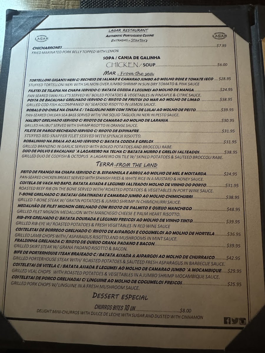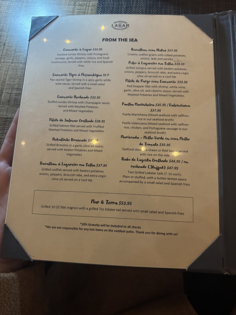 Paella Marinheira (Mixed seafood with saffron-rice in our seafood broth) Paella Valenciana (Mixed seafood with saffron-rice, chicken, and Portuguese sausage in our seafood broth)