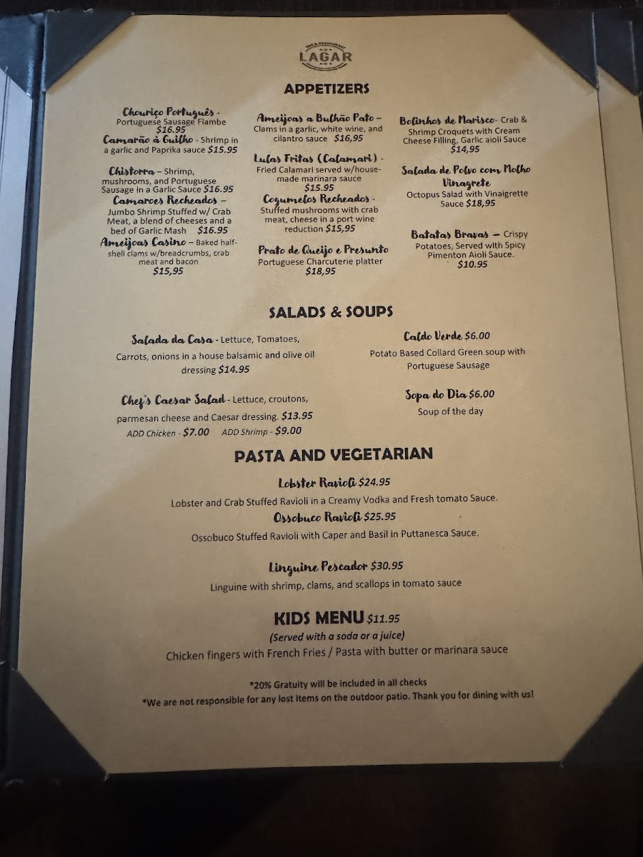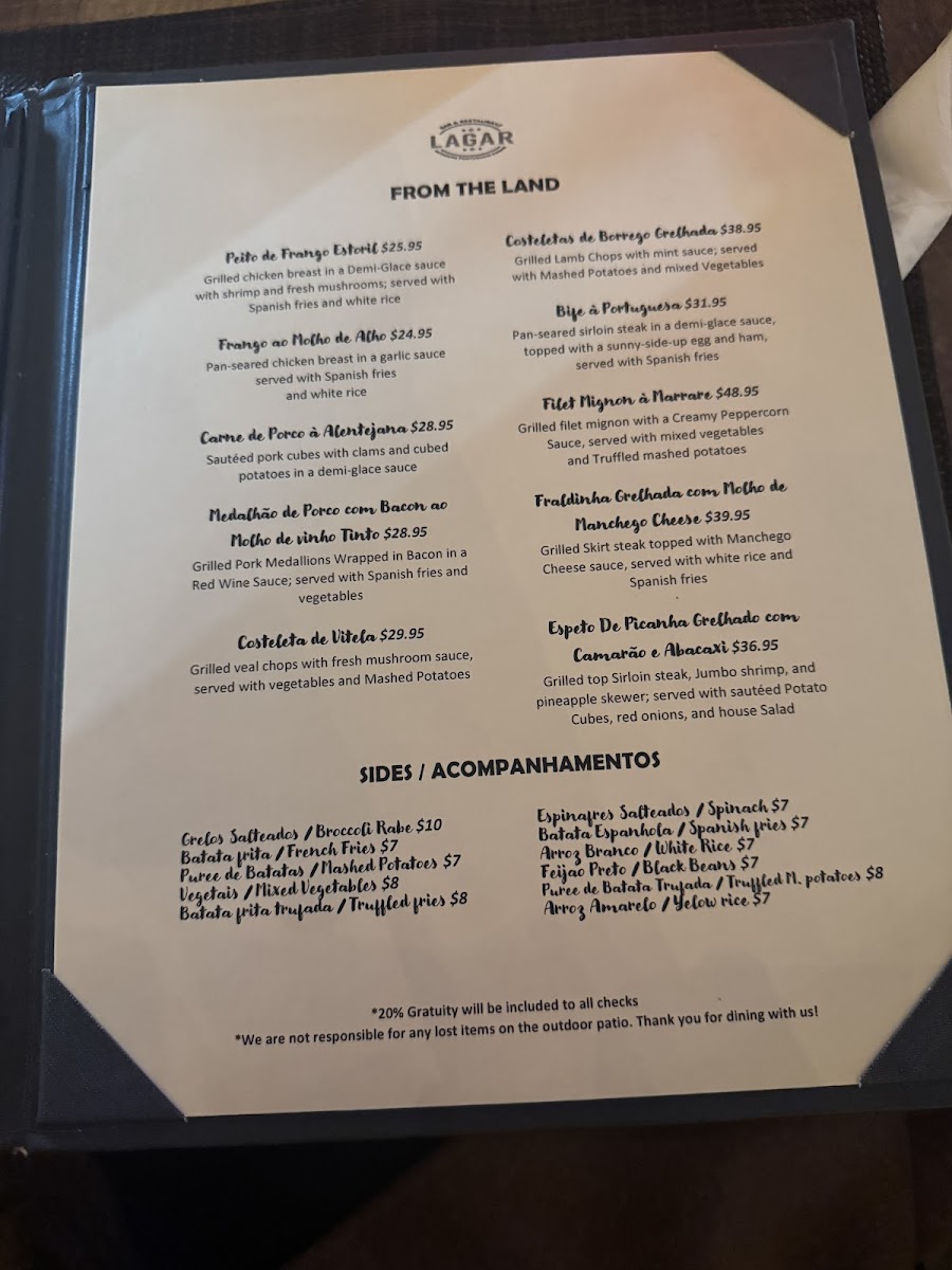 Sautéed Jumbo Shrimp with Portuguese sausage, garlic, peppers, onions and fresh mushrooms; served with white rice and Spanish fries